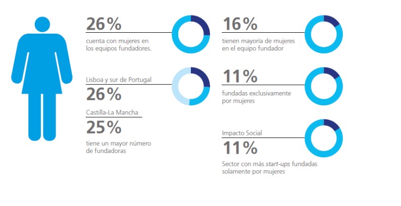 En esta edición, el sector con mayor cantidad de start-ups fundadas únicamente por mujeres es el de impacto social, que abarca el 11% de estas empresas. A nivel geográfico, hay una región que destaca por tener un porcentaje de empresas fundadas totalmente por mujeres mayor que la media: Castilla-La Mancha, con un 25%.